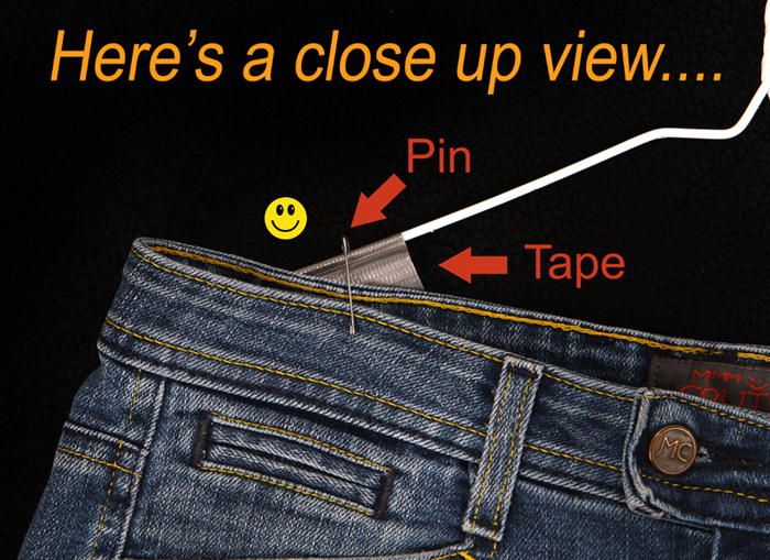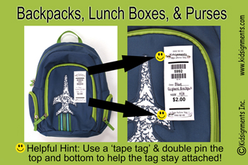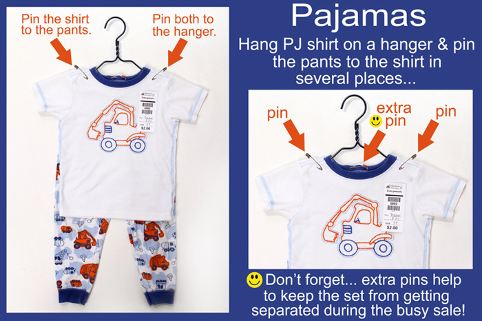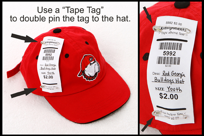 The 'pin tags' are used primarily for clothing. Use a sturdy silver safety pin to secure one tag to each of your clothing items. Use only one tag per item or set... even if the set has multiple pieces. Pin tag to top left of clothing, or your right as you are looking at it. Hang clothes on the hanger so that the hanger looks like a "?" (question mark). Make sure that the tag is pinned above the bold line that appears under the word "Kidsignments." Our volunteers cut the tags off of the items at checkout on this line. To see samples of this, simply look at the pictures below. Here's a helpful hint... most Dollar Tree's have boxes of safety pins containing 200 for $1.00. You can also order them in bulk from companies online... just make sure they are strong and sturdy. Need help determine the right size to write on your tag for clothing? Check our size list to make sure we have a rack for your size.