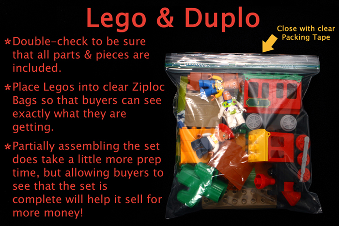 Put small items in a Ziploc-style bag. Attach a 'tape tag' to the outside of the bag with masking tape on both the top and the bottom of the tag but NOT on the sides of the tag. Tape the top of the bag closed with masking tape to be sure the bag remains closed. If the bag contains parts or pieces that go with a larger item, then place the tag on the main item and use masking or packing tape to secure the bag of small parts to the toy itself. Be sure to use masking tape to write your seller number on the Ziploc bag should the two parts become separated. You can see pictures of both scenarios by looking at the pictures of the "Go Diego Go" toys below.