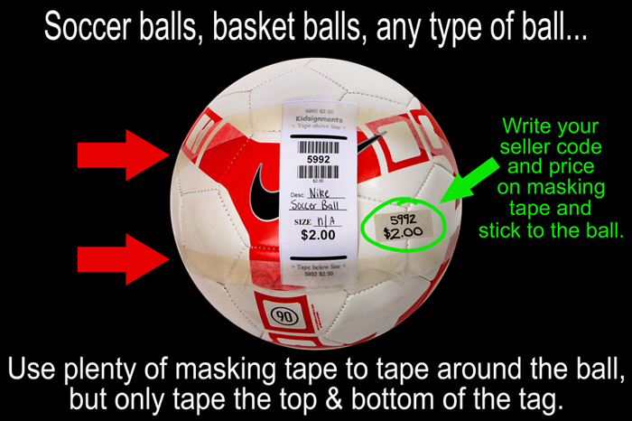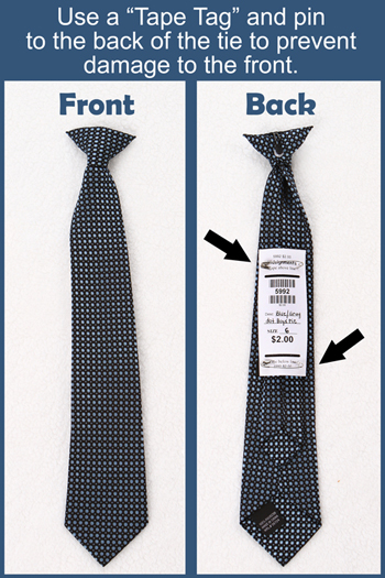 For toys and other hard surface items, use our specially designed 'tape tags' which have been specifically created to be 'taped to' instead of 'pinned on' items. This allows our volunteers to quickly and cleanly remove the tag during checkout by cutting the tags on the cut lines. Secure tag with masking tape to toys and other 'hard surface' items… DO NOT use clear packing tape or scotch tape as this causes the tags to tear during removal at check-out and also impairs the barcode from being read with a barcode scanner. You may however use packing tape to bundle items together, but do not use it to secure tags! Remember to ONLY tape the TOP and BOTTOM of the tag and do not cover the bold 'cut' lines. You can see samples of how to tape tags the correct way in the pictures below.