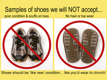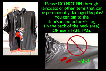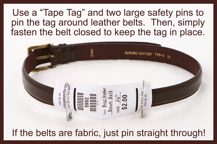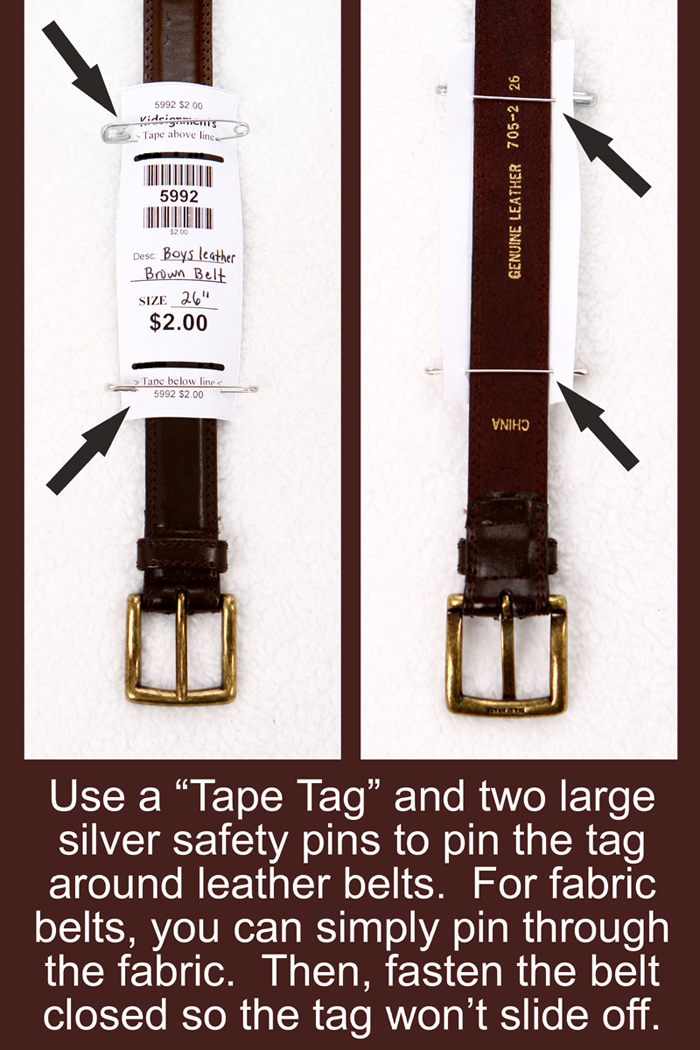 For shoes, use zip-ties (these work great!) or ribbons to tie both shoes together. To make double-sure your shoes do not get separated and end up in the lost and found, write your seller code on bottom of each shoe with a piece of masking tape. Each additional step you take will help make sure your item stays together and on the sales floor!