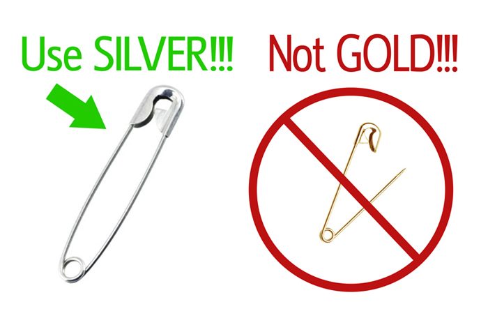 DO NOT USE TINY GOLD PINS, (they are not sturdy enough), STRAIGHT PINS, (ouch!) or STAPLES!